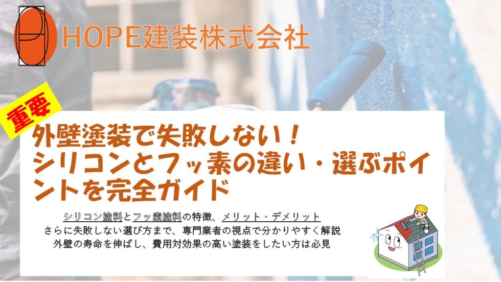 外壁塗装を検討すると必ず迷うのが「シリコン」と「フッ素」のどちらを選ぶべきかという問題です。どちらも人気の高い塗料ですが、耐久性・価格・コストパフォーマンスの違いを理解して選ばなければ、施工後に「後悔した…」という結果になりかねません。本記事では、シリコン塗料とフッ素塗料の特徴、メリット・デメリット、さらに失敗しない選び方まで、専門業者の視点で分かりやすく解説します。外壁の寿命を伸ばし、費用対効果の高い塗装をしたい方は必見です。